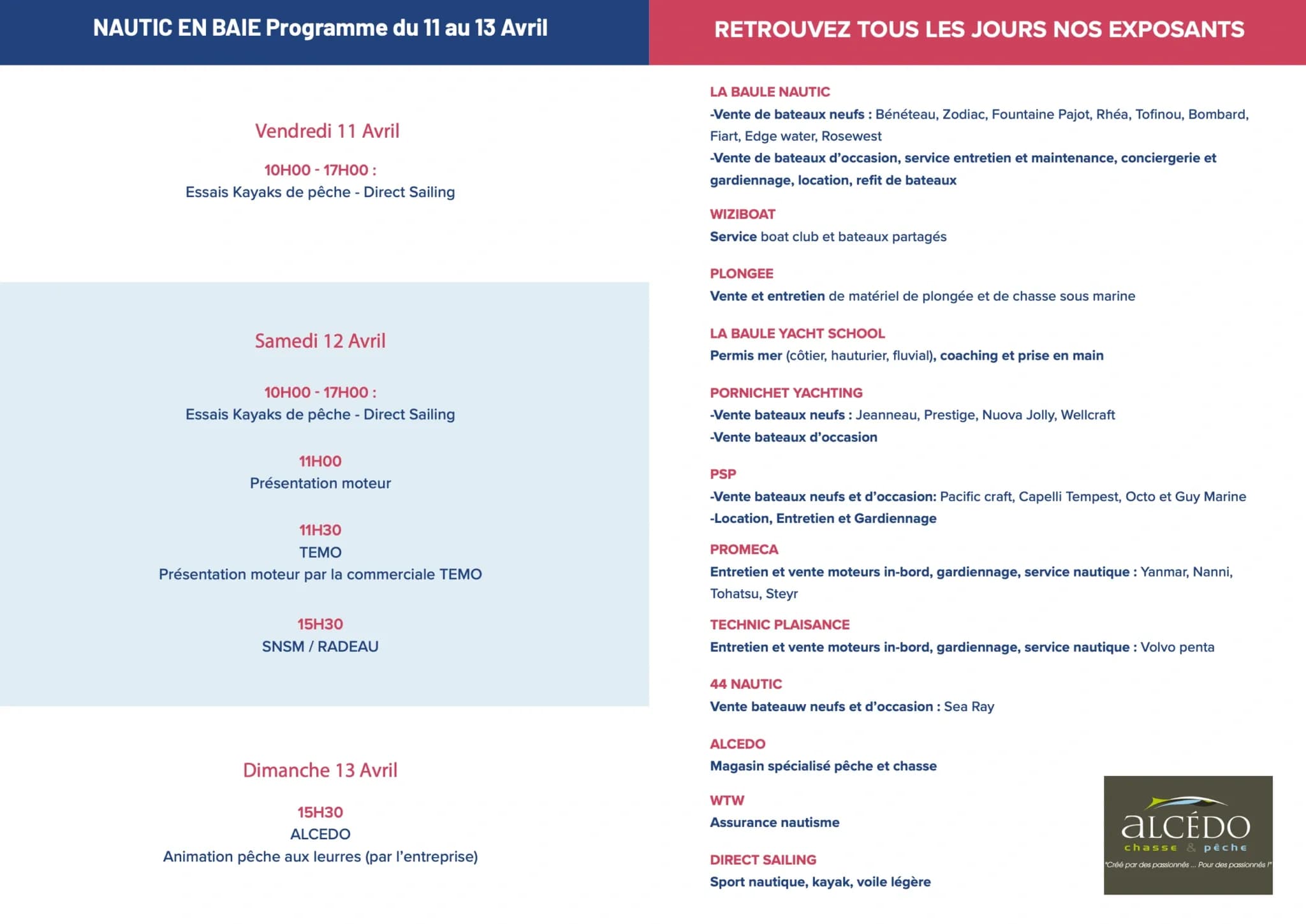 Pornichet Service Plaisance : Vente bateau neuf et occasion, location, entretien, gardiennage Présence pendant les 3 jours du salon Promeca : Entretien et vente Moteur in-bord gardiennage, service nautique Présence pendant les 3 jours du salon Technic Plaisance : Entretien et vente Moteur in-bord gardiennage, service nautique Présence pendant les 3 jours du salon 44 Nautic : Vente bateau neuf et occasion Présence pendant les 3 jours du salon Alcedo : Magasin spécialisé pêche et chasse sous marine Présence pendant les 3 jours du salon WTW : Assurance nautisme Présence pendant les 3 jours du salon Direct Sailing : Sport nautique, kayak, voile légère Présence pendant les 3 jours du salon HSD voilerie : Fabriquant de voile Présence pendant les 3 jours du salon